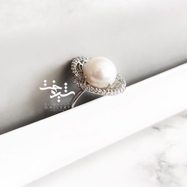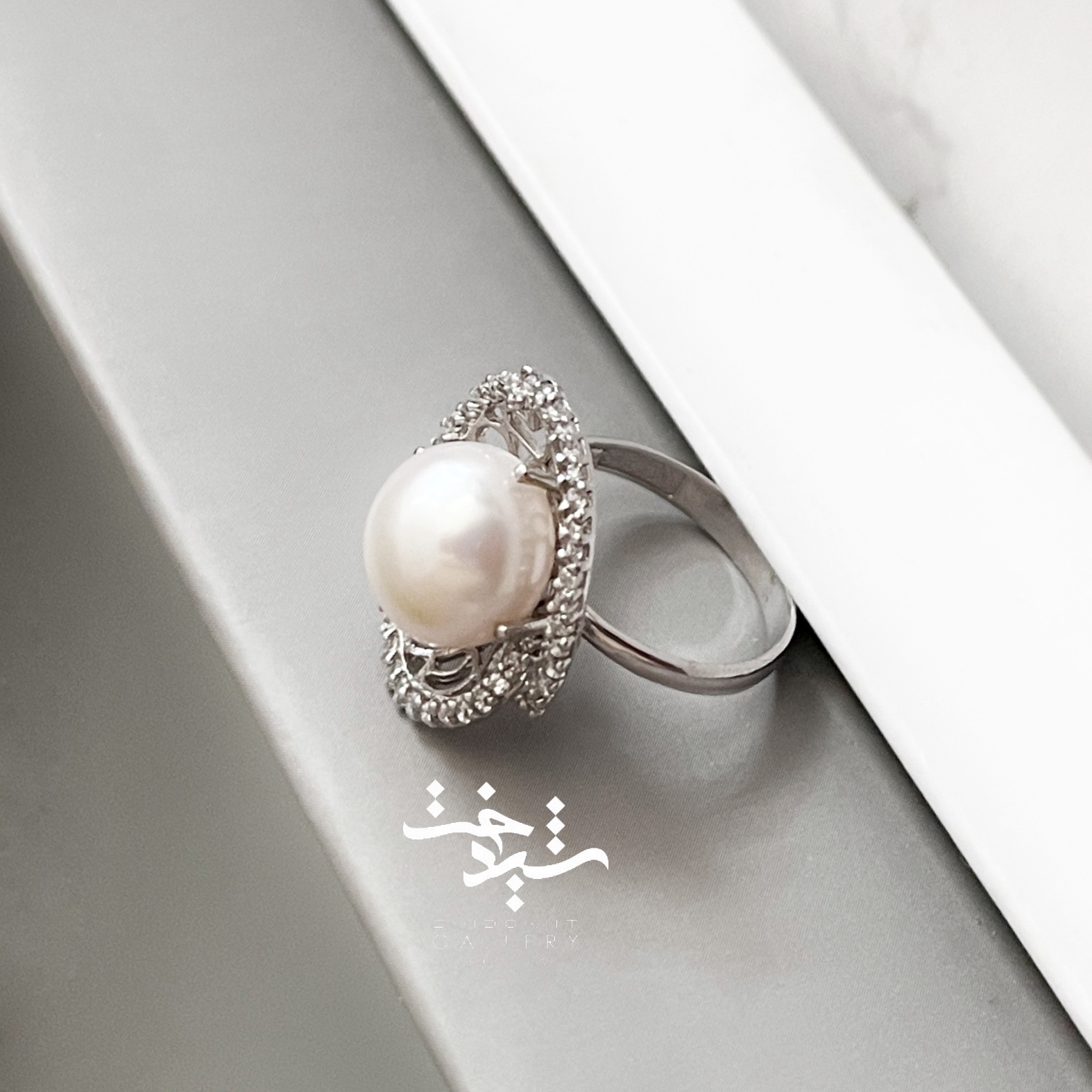 انگشتر مروارید اصل نقره مدل زحل از مجموعه زیورالات دستساز خانه مروارید شیدخت بوده که با آبکاری باکیفیت رودیوم(طلای سفید) پوشیده شده است و با سایز مورد نظر شما قابل سفارش است